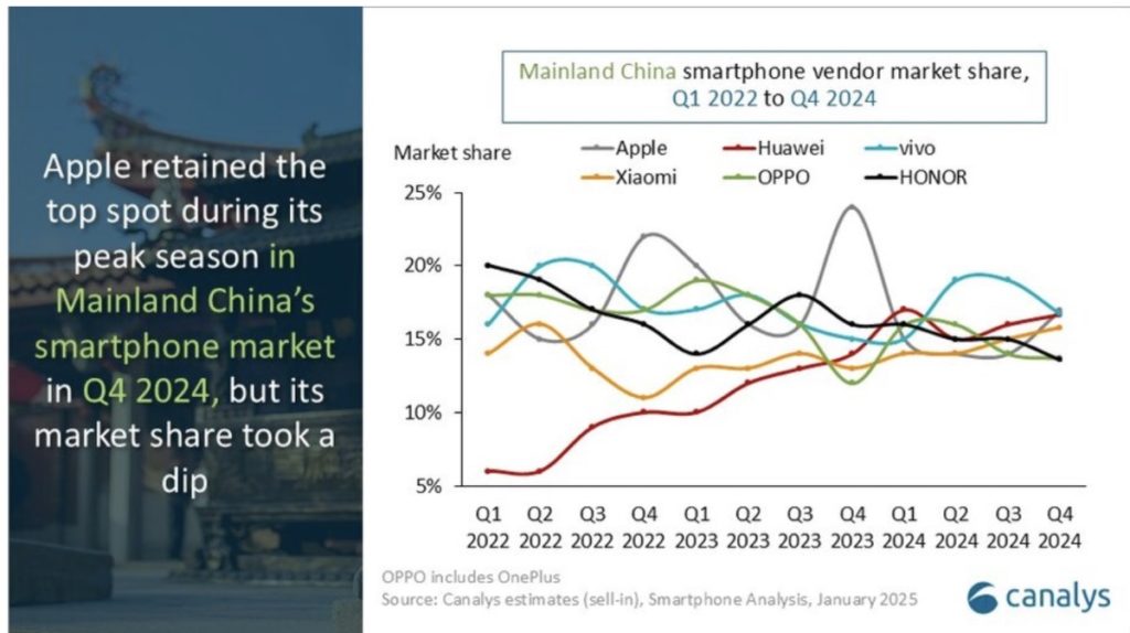Apple retained the top spot during its peak season in Mainland China’s smartphone market in the fourth quarter (Q4) of 2024, but its market share took a dip.