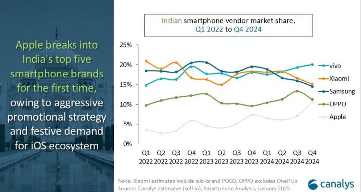 Apple captured fifth place in India smartphone shipments for the first time in the fourth quarter of 2024, bolstered by aggressive promotions and strong festive demand, according to Canalys.