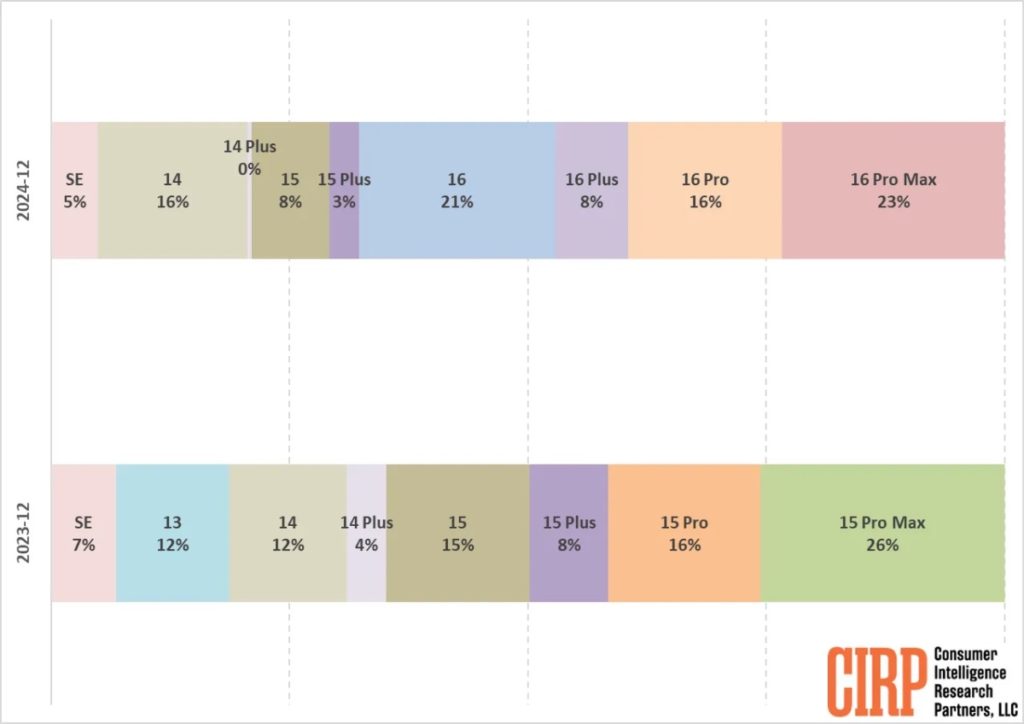 From the CIRP report: We also saw the oldest models do better in the December 2024 quarter compared to the prior year. In particular, the two-year old iPhone 14 had 16% of sales in the quarter. By comparison, the two-year old model in the December 2023 quarter, iPhone 13, had only 12% of sales.
