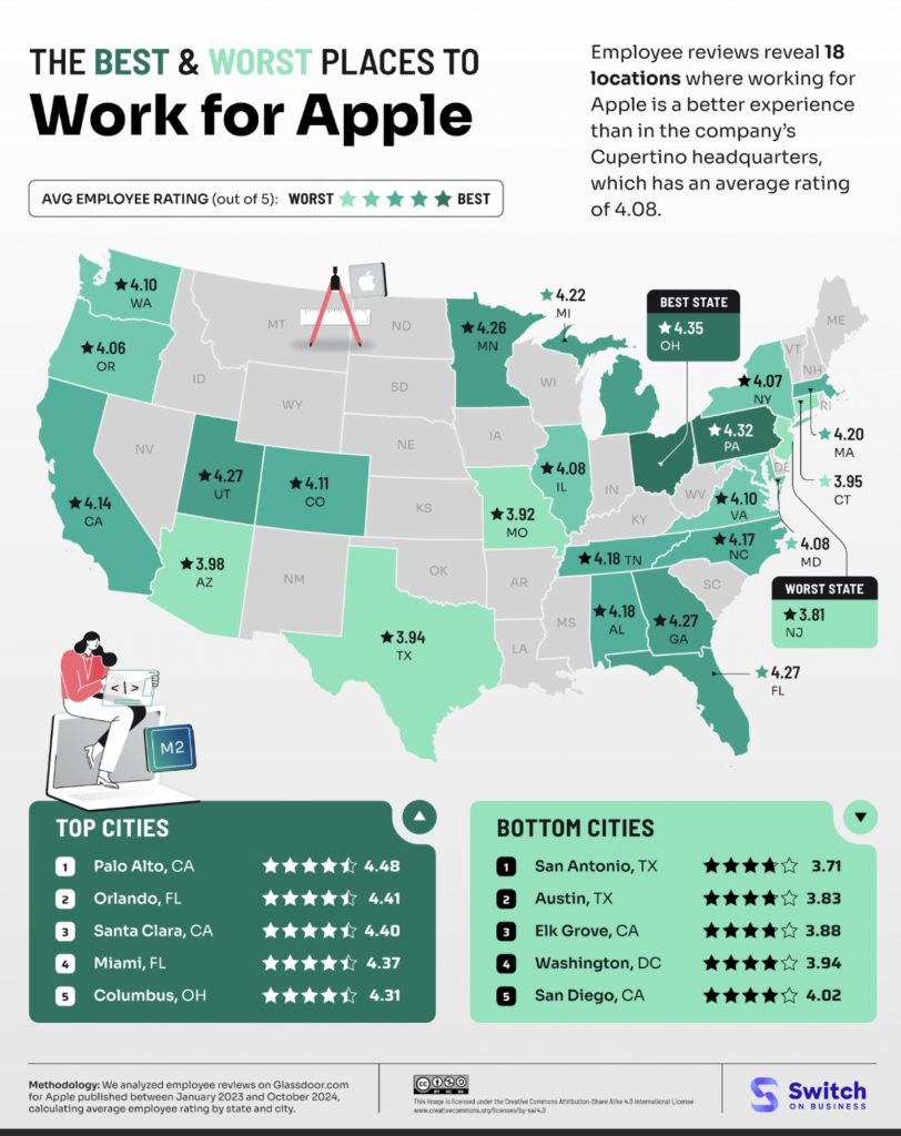 The latest study from Switch On Business reveals the best and worst places to work for Apple. To uncover these findings, the team analyzed employee reviews on Glassdoor.com for Apple published between January 2023 and October 2024, calculating the average employee rating by state and city.