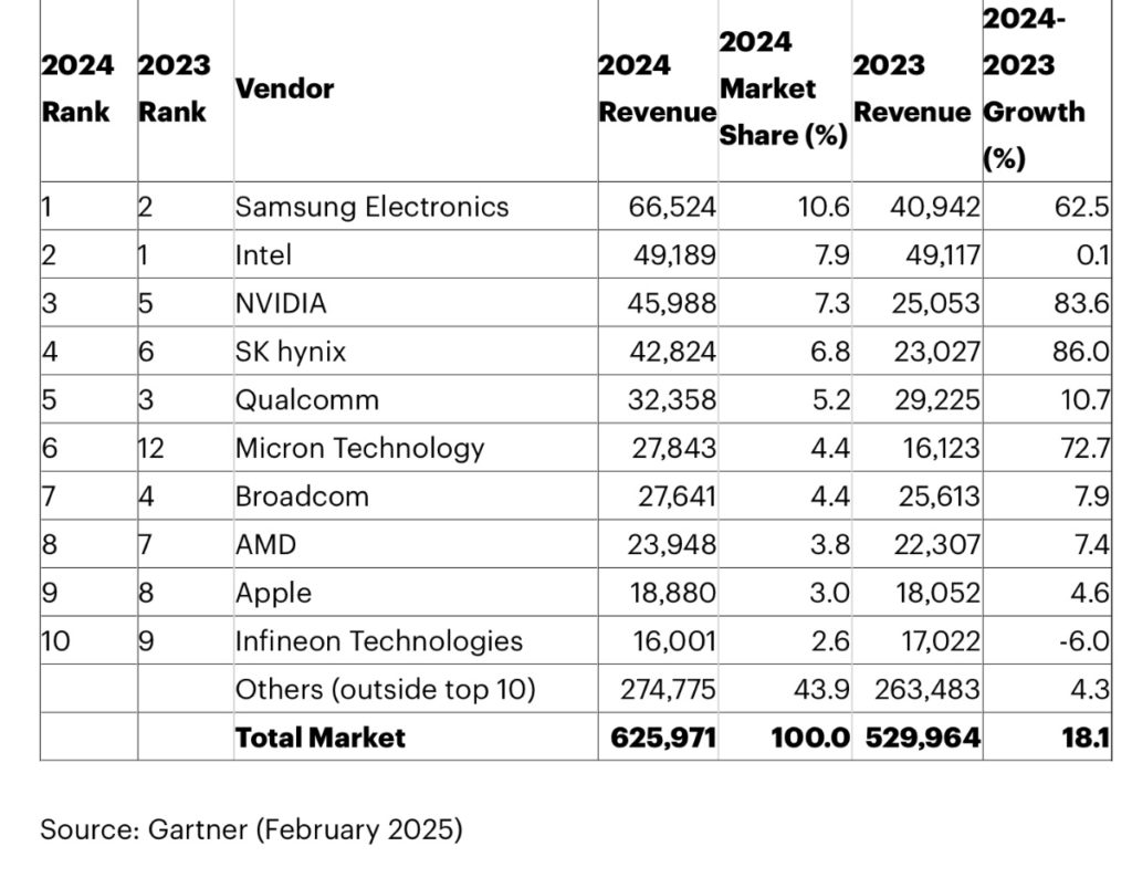 ● Intel moved to the No. 2 position as its product set — AI PCs and the Core Ultra chipset — was insufficient to offset the limited success of its AI accelerator offering and the modest growth in its x86 business. Intel’s semiconductor revenue was flat at 0.1% growth in 2024.