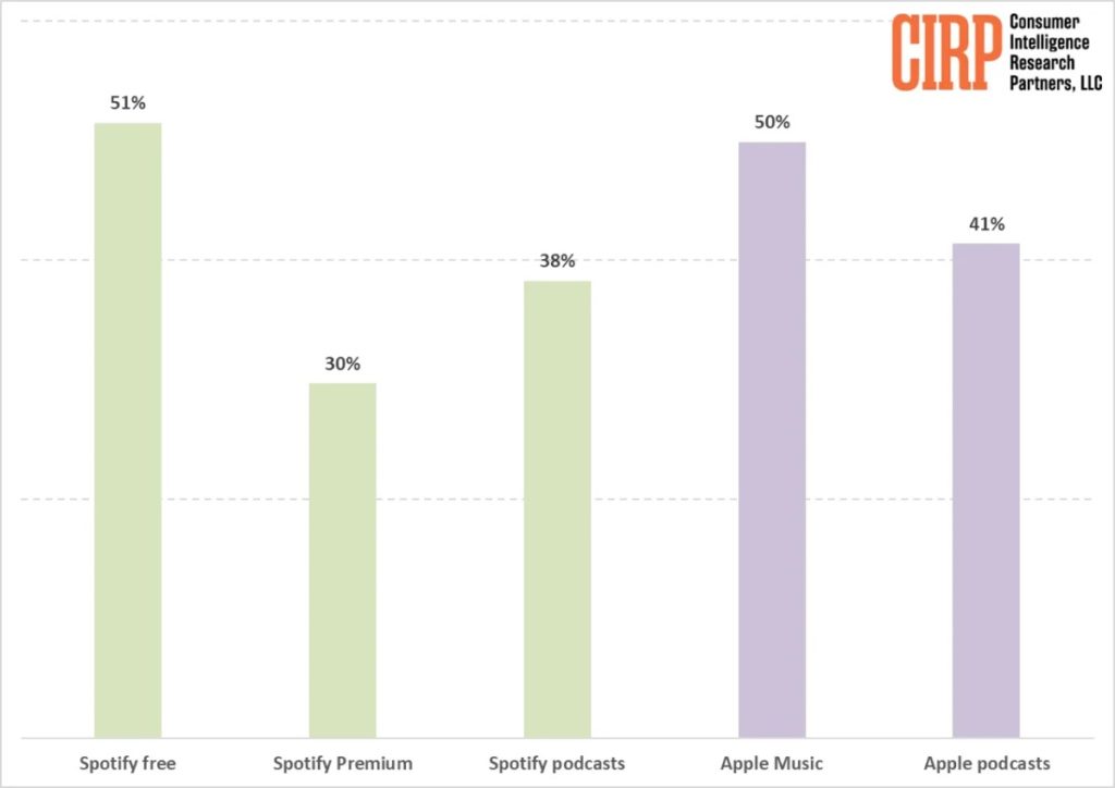 ° Apple customers use Spotify (free and/or paid) to a roughly similar extent as Apple Music. Podcast use is similar, too, with 38% of Apple customers using Spotify for podcasts and 41% reporting using the Apple podcast app. For music, the paid Spotify Premium service lags Apple Music, with 30% of customers paying for Spotify. The free Spotify service is as popular as Apple Music, with 51% of Apple customers using it