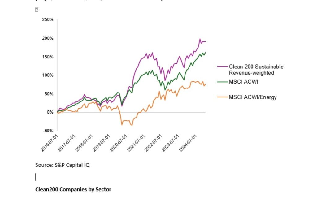 ° Clean200 companies generated a total return of 190.9% on a sustainable revenue-weighted basis outperforming the MSCI ACWI index (162.0%) and the MSCI ACWI/Energy Index of fossil fuel companies (76.7%) on Total Return Gross — USD Basis from the Clean200 inception of July 1, 2016, to Jan. 29, 2025.