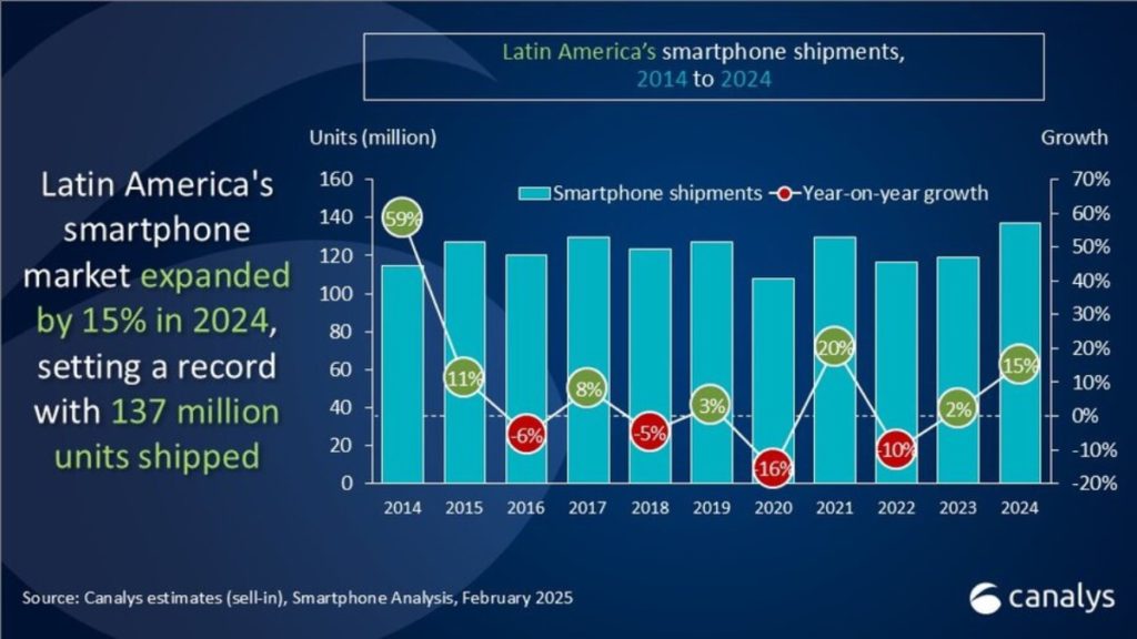 The latest research from Canalys, now part of Omdia, reveals that the Latin American smartphone market grew 15% in 2024, achieving a record shipment of 137 million units.
