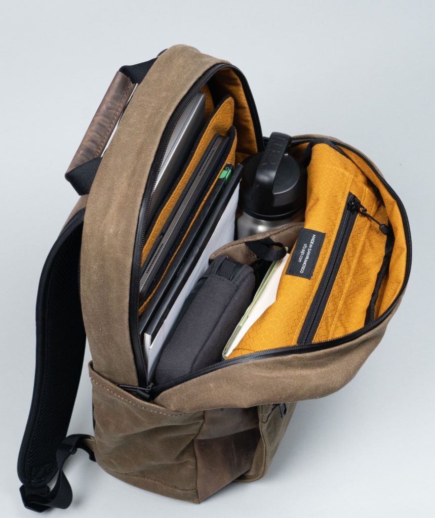 WaterField Designs Founder Gary Waterfield says the Shinjuku Backpack utilizes lightweight XPac Canvas, a highperformance technical fabric made with ultrathin, waterproof laminate for maximum strength at minimal weight. Also available in waxed canvas for a classic aesthetic that develops character over time, both versions feature full-grain leather accents and a gold, waterresistant interior liner that illuminates contents, he adds.