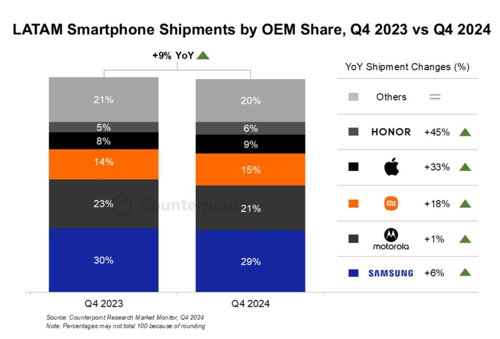 The Latin American smartphone market’s shipments grew 9.3% year-over-year (YoY) in quarter four (Q4) 2024, marking its sixth consecutive quarter of expansion, according to Counterpoint.