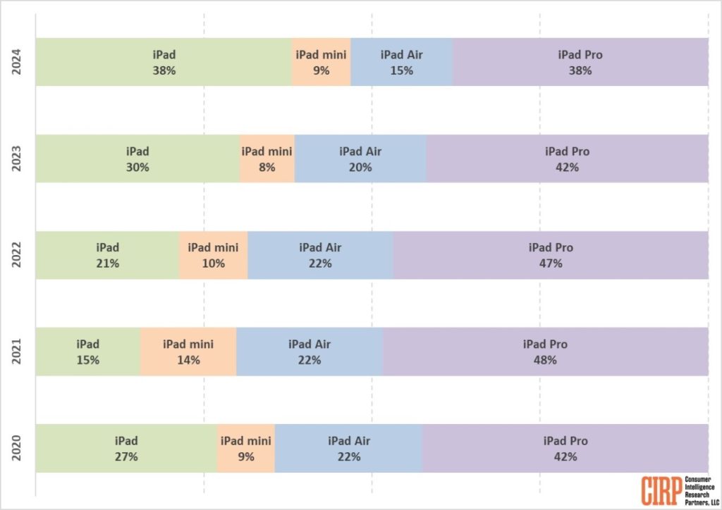 The research group looked at the last five years of iPad sales. Apple has sold four different iPad models: iPad, iPad mini, iPad Air, and iPad Pro, in different sizes and configurations. Apple has introduced and retired versions of each model at different times and has sold some version of all four in each of the past five years.