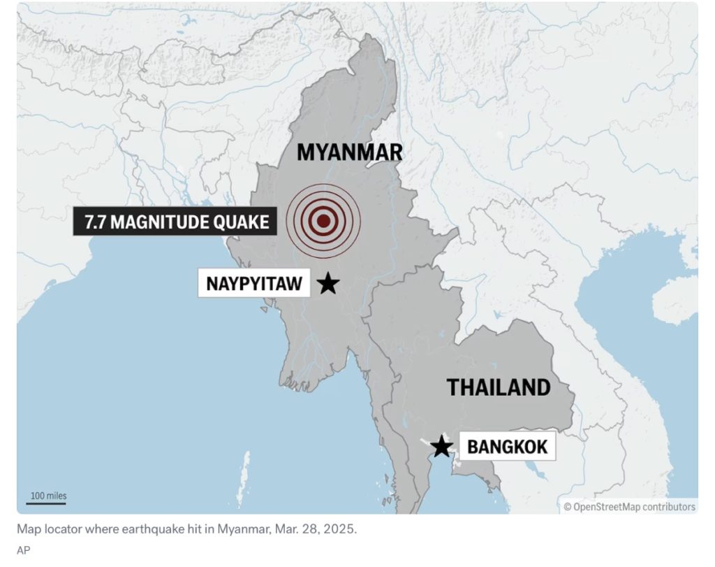 A 7.7 magnitude earthquake rattled much of Southeast Asia on Friday, resulting in mounting casualties and flattened skyscrapers from Myanmar to Thailand. The epicenter was in Mandalay, Myanmar, the country’s second-largest city. Even Bangkok, some 600 miles away, felt widespread shaking and saw significant damage from the quake — including the total collapse of a skyscraper under construction, according to ABC News.