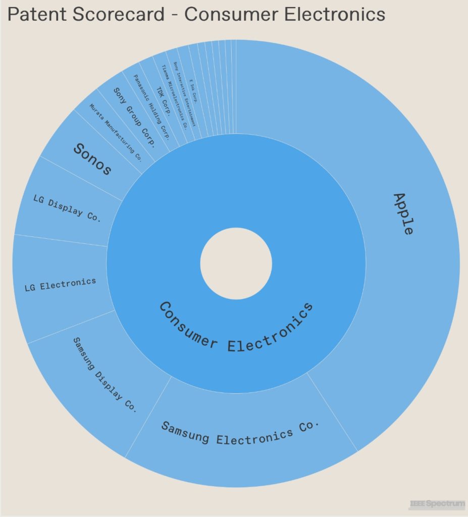 In the Consumer Electronics category, Apple leads the pack by a large margin, with about 40% of the category’s patent power. Samsung has patents filed both under its primary company, Samsung Electronics, and a subsidiary that focuses on display technology. These two companies take the second and third place in the category. But even grouped together,” their combined patent power is well behind Apple’s,” notes IEEE Spectrum.