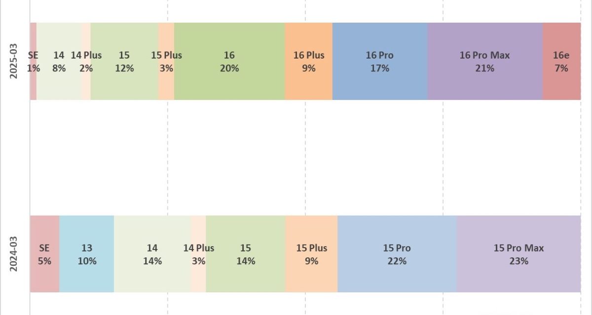 That is more than the 68% share for the four then-current iPhone 15 models in the March 2024 quarter. The introduction of the iPhone 16e accounts for the entire difference, but there were notable shifts among the other models’ shares as well.