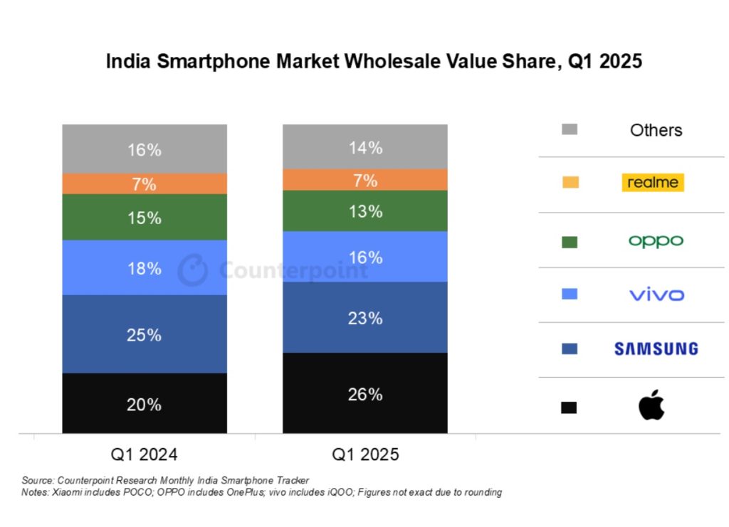 “Apple continued its strong upward trajectory, recording 29% year-over-year growth and its highest-ever quarter one volumes in India, further cementing its dominance in the premium segment,” says Senior Research Analyst Prchir Singh. “This performance underscores the growing appeal of high-end devices across the country, with Apple also leading the market in terms of value.”