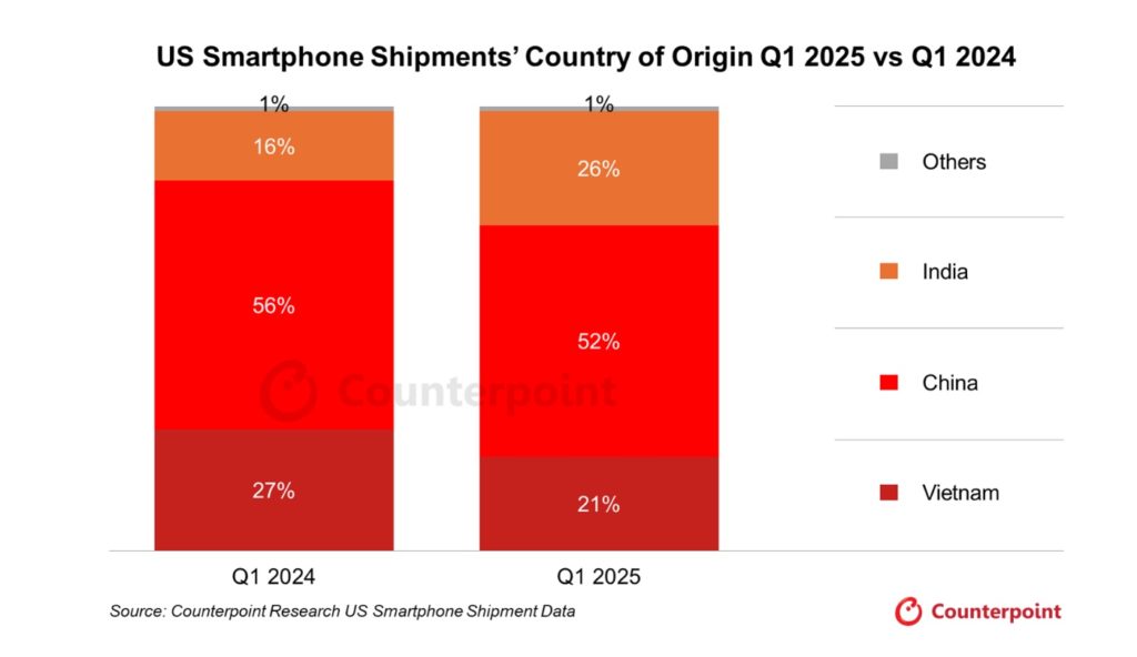 The research group notes that tariffs drove a shift in the country-of-origin mix away from China in quarter one (Q1) of 2025 with a strong uptick in shipments from India in March. Apple, Samsung and Motorola all saw their shipment contribution from India increase. India-manufactured devices represented 26% of Q1 2025 shipments, up from 16% in Q1 2024.