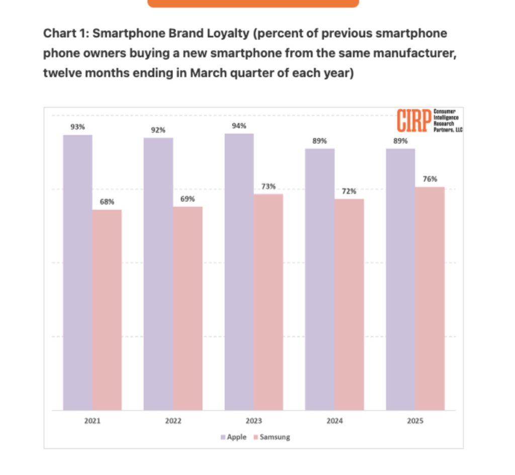 A new report from Consumer Intelligence Research Partners says Apple’s dominance in smartphone brand loyalty is no longer growing and Samsung is catching up.
