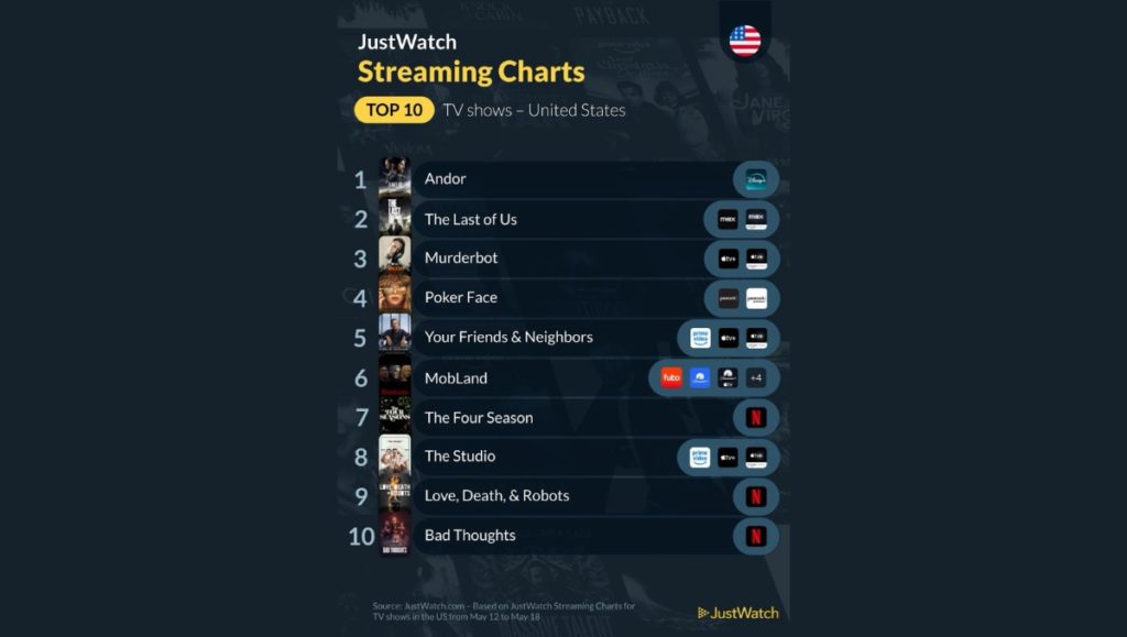 “Murderbot” is number three on the list. It’s followed by “Your Friends & Neighbors” at number five and “The Studio” at number eight. JustWatch is a streaming guide for movies, TV shows, and sports.