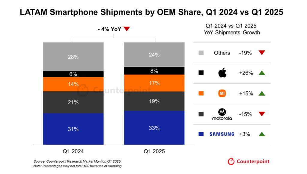 LATAM smartphone shipments fell 4% year-over-year (YoY) in (Q1) 2025 to mark the region’s first decline since Q2 2023, according to the latest Counterpoint Research Market Monitor report. However, it was good news for Apple.