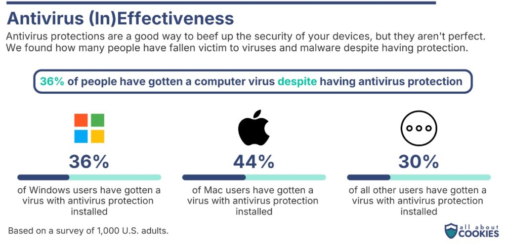 ° Forty-four percent of Mac users say they have gotten a virus before, despite having antivirus software installed, the highest rate of any operating system.