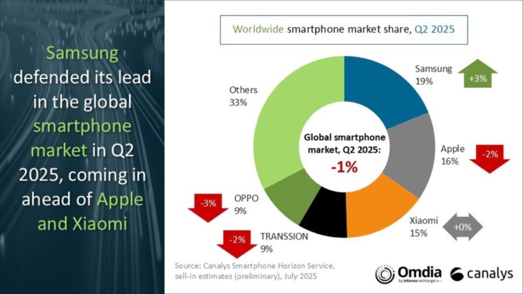 The latest research from the Canalys research group reveals that the global smartphone market declined by 1% year-on-year in the second quarter (Q2) of 2025, marking the industry’s first decline in six quarters.
