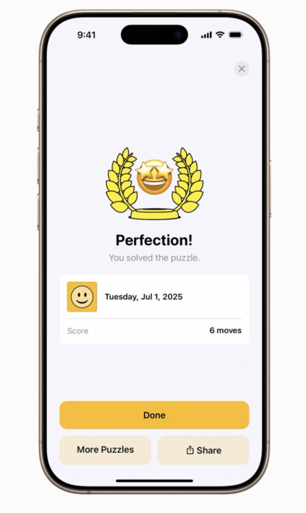 Emoji Game challenges players to use a selection of emoji — including Genmoji created using Apple Intelligence — to fill in the blanks of three short phrases using as few moves as possible. Each phrase is accompanied by a clue, which the user can choose to reveal, but that will count toward the player’s total number of moves.