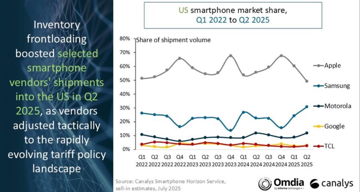 New research from Canalys reveals that United States smartphone shipments grew by 1% in quarter two (Q2) 2025 as vendors continued to frontload device inventories amid tariff concerns.