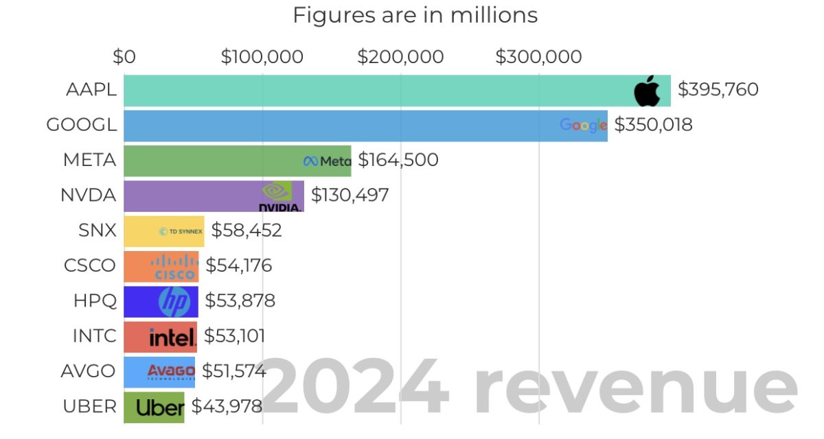 The top 10 companies on the list are Apple, Alphabet, Meta, Nvidia, TD Synnex, Cisco, HP, Intel, Broadcom, and Uber.