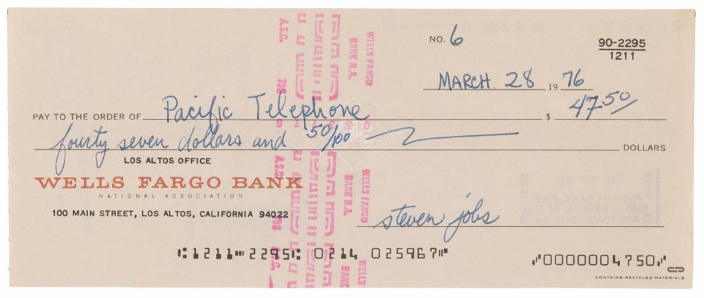 The Wells Fargo temporary check, dated March 28, 1976, was completed and signed “steven jobs” and made payable to Pacific Telephone for $47.50. Significantly, the reverse side includes a teller’s notation: “DBA Apple Computer Co., Steven Jobs & Stephen Wozniak & Ronald Wayne, 770 Welch Rd., Palo Alto.” Including all three names—Jobs, Wozniak, and Wayne—makes this a singular surviving document capturing the fleeting original Apple partnership.