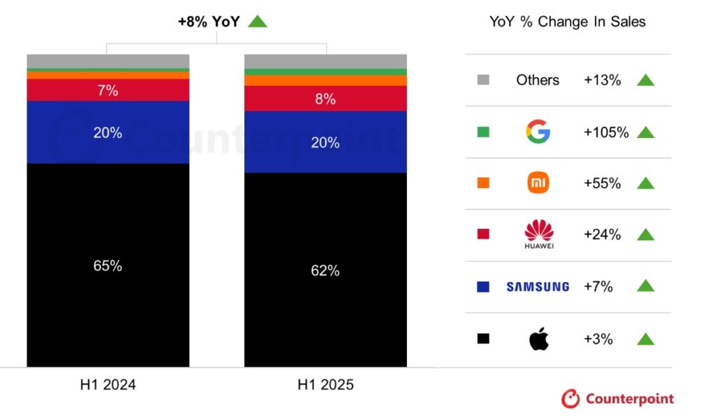 The global premium smartphone market’s unit sales grew 8% year-over-year (YoY) in the first half (H1) of 2025, reaching the highest-ever mark for an H1, according to new data from Counterpoint Research.