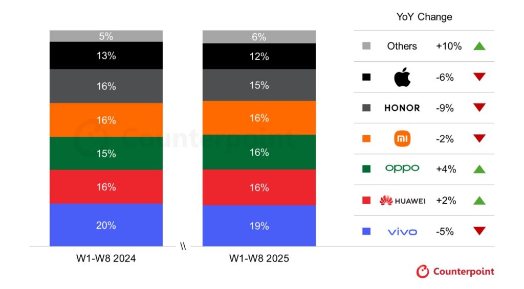 China’s smartphone sell-through fell 2% year-over-year in the first eight weeks of quarter three of 2025, according to new data from Counterpoint Research.