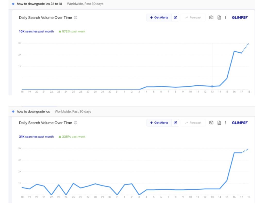 New research from cloud-based call center MightyCall reveals searches for “how to downgrade iOS 26 to 18” have jumped 572% compared to last week, while general searches for “how to downgrade iOS” have surged 335%.