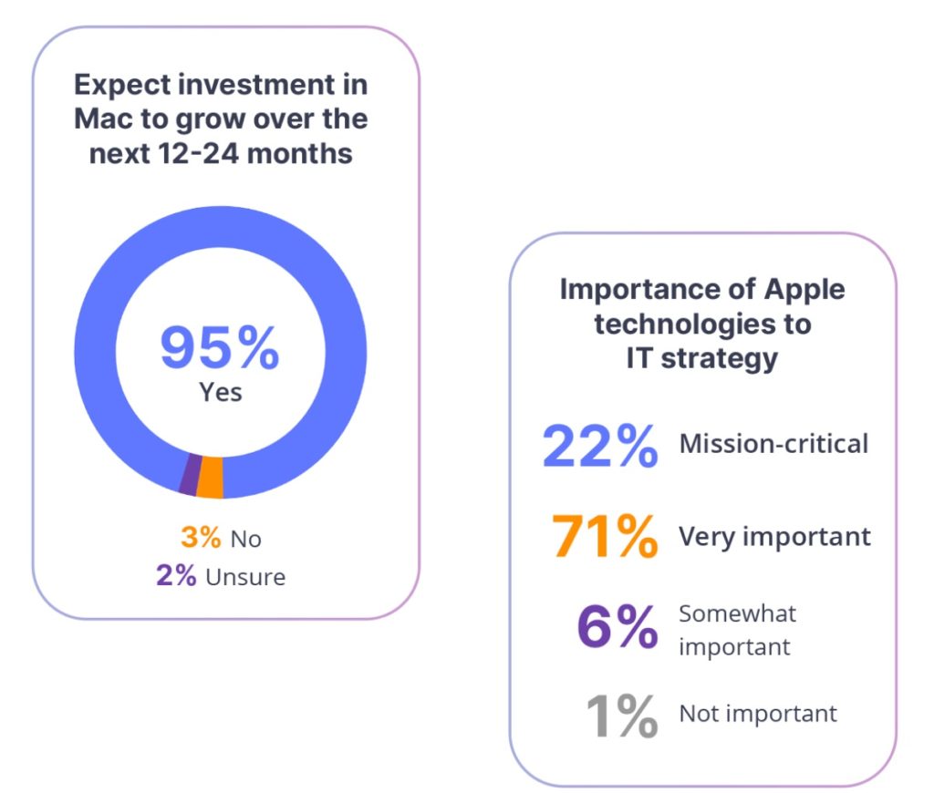 The survey of 300 U.S. CIOs found that Apple accounts for an average of 63% of enterprise endpoints, with an overwhelming 96% of CIOs expecting Mac investments to grow in the next 12–24 months. Nearly all respondents (99%) consider Apple technologies important to their IT strategies, with more than one in five (22%) describing them as mission-critical.