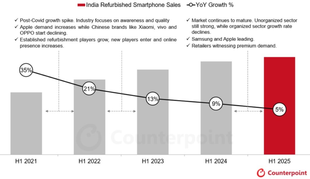 India’s refurbished smartphone sales grew 4.9% year-over-year in the first half of 2025, driven by strong second quarter sales, according to new data from Counterpoint Research.