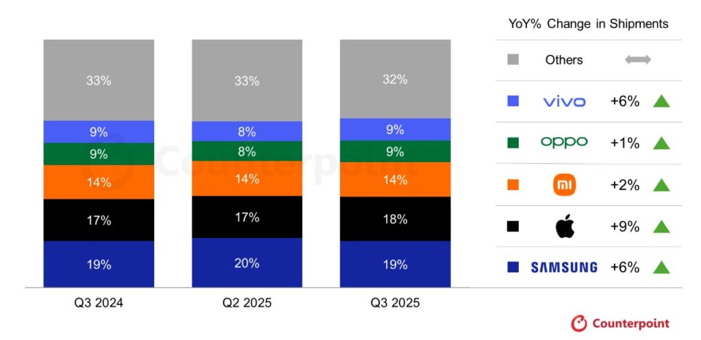 The global smartphone market’s shipments grew 4% year-over-year (YoY) in the third quarter of 2025, driven by strong performance in the Asia-Pacific (APAC) and Middle East and Africa (MEA) regions, according to new data from Counterpoint Research.