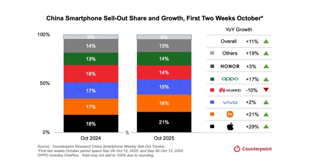 The report says iPhone sales slipped 2% YoY. However, Counterpoint says that slowing sales of older gen iPhones was offset by especially strong performance of the iPhone 17 series, which far outperformed the iPhone 16 series over initial availability periods. The base iPhone 17 has been very popular, with storage upgraded from 128GB to 256GB while maintaining a starting price of RMB 5,999, offering consumers excellent value for money.