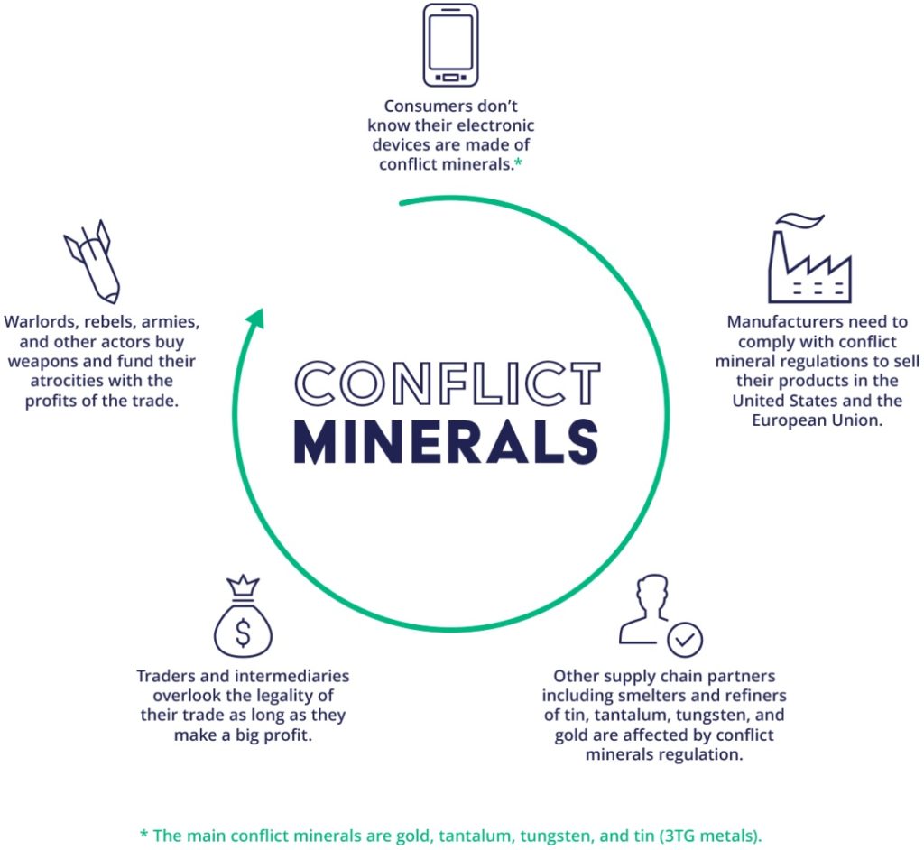 The main three conflict minerals are tin, tungsten, and tantalum (the 3 Ts), but gold can also be included. A common source of these minerals is the Democratic Republic of Congo (DRC), an area with ongoing violence and human rights violations.