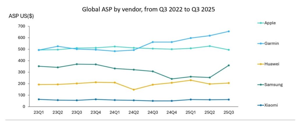 The Average Selling Price (ASP) rose 9% annually to US$225, driven predominantly by the market’s largest players. The top five vendors – Xiaomi, Apple, Huawei, Samsung, and Garmin – together accounted for 84% of the market’s total value and 63% volume share.