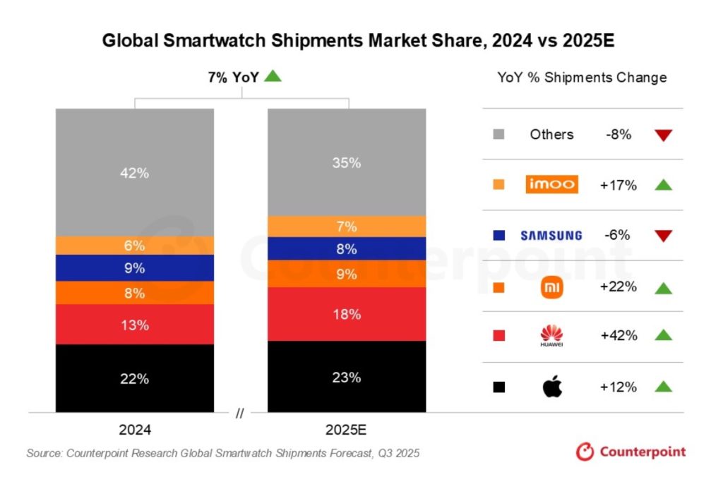 Global smartwatch shipments are projected to grow 7% year-over-year (YoY) in 2025, led by Apple and China-based Huawei and Apple, according to new data from Counterpoint Research.