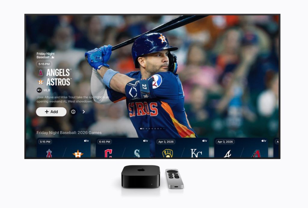 Beginning opening day on March 26, fans in the U.S. can enjoy the MLB Big Inning whip-around show, featuring live look-ins and in-game highlights every weeknight, and a full slate of MLB-related content on Apple TV, including Countdown to First Pitch, MLB Daily Recap, and MLB This Week. Fans can also access MLB programming free on the Apple TV app, including game recaps, classic games, highlights, interviews, and more.
