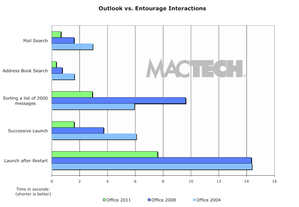 In the case of Outlook 2011, it’s not about a new version, it’s a completely new application replacing Entourage 2008. That said, there are certain things that we can still compare. Like the other apps, launching is far faster. Also, the user interactions like sorting, searching the address book, and searching mail are all significantly faster as well. Address book search is beyond fast, it’s basically instantaneous even on an address book with thousands of entries.
