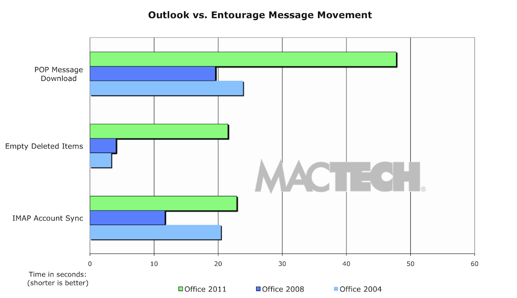 We were a bit surprised to see the POP and IMAP downloads be slower in Outlook than in Entourage 2008. Part of the reason we were surprised is that it felt faster in some ways. We were perplexed enough that we asked Microsoft engineers what was going on. They said that Outlook performance being slower was “deliberate.” Specifically, “network performance competes with user interface performance and we throttle back the network a bit to make the user interface more responsive.” That’s why the app felt faster, while the stopwatch times on the network activities was slower.