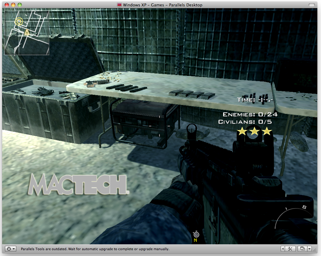 Parallels was able to render all the objects, and the textures properly. In the screen shot, you can see the cases, the tables, the soldier’s weapon, and even the generator under the table.
