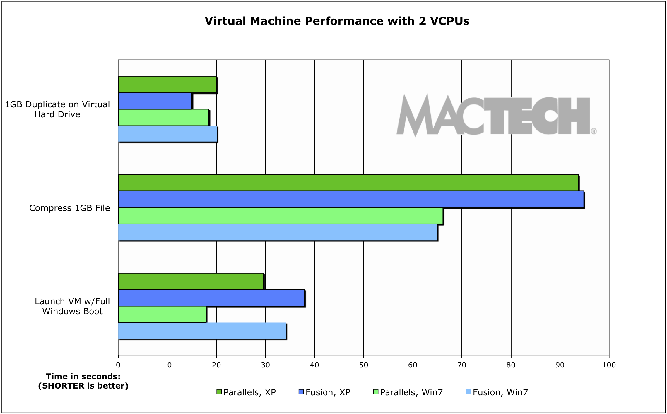 In virtual machine performance with two virtual CPUs, we saw fairly predictable results. File duplication tests were split: VMware won under XP, and Parallels won under Win7. Compression tests were also split, but fairly close regardless. Launch virtual machine time, however, goes again to Parallels with noticeably faster full Windows boot times.
