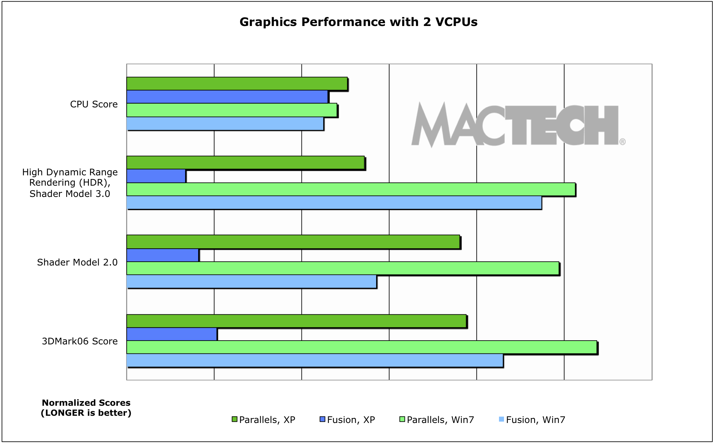 Graphics performance with two virtual CPUs became even more pronounced, especially under Windows XP where Parallels Desktop was 3-4x faster than VMware Fusion. VMware Fusion scored considerably better on graphics tests under Windows 7. That said, Parallels Desktop continued to be faster there as well.