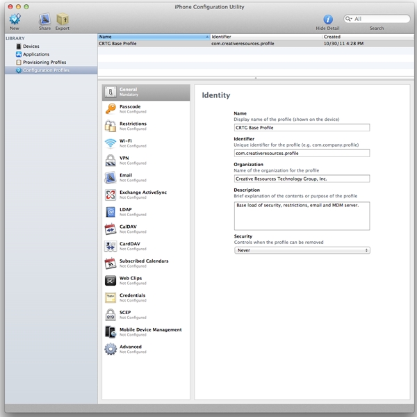 The data on a configuration profile can contain sensitive information such as account information and passwords. iPCU allows three options for exporting out the profiles you have built and protect your data.