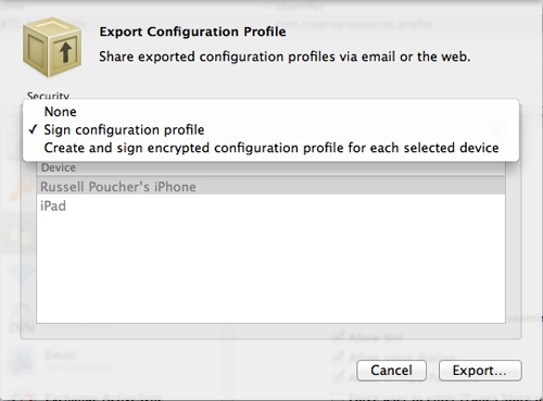 - Create and sign encrypted configuration profile for each selected device (best security) – Signs the profile so it cannot be altered, encrypts all the contents so the profile cannot be viewed in a text editor, and can be installed only on specific devices that appear in the Devices list. Separate .mobileconfig files are created for each of the devices you select from the Devices list. In most cases, this is the best option to select and offers the highest amount of security.